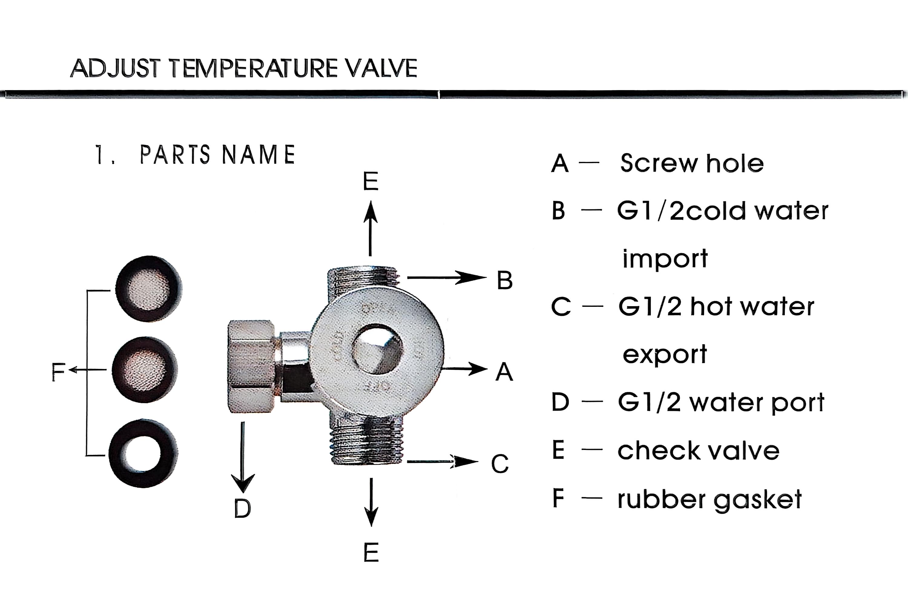 La válvula incluye varias partes clave: agujeros de tornillo (A) para el montaje seguro, una importación de agua fría G1/2 (B), una exportación de agua caliente G1/2 (C) y un puerto de agua G1/2 general (D). Además, está equipado con una válvula de retención (E) para evitar el flujo de retorno y mantener una presión consistente, junto con una junta de goma (F) para garantizar un sello estancado y evitar fugas.